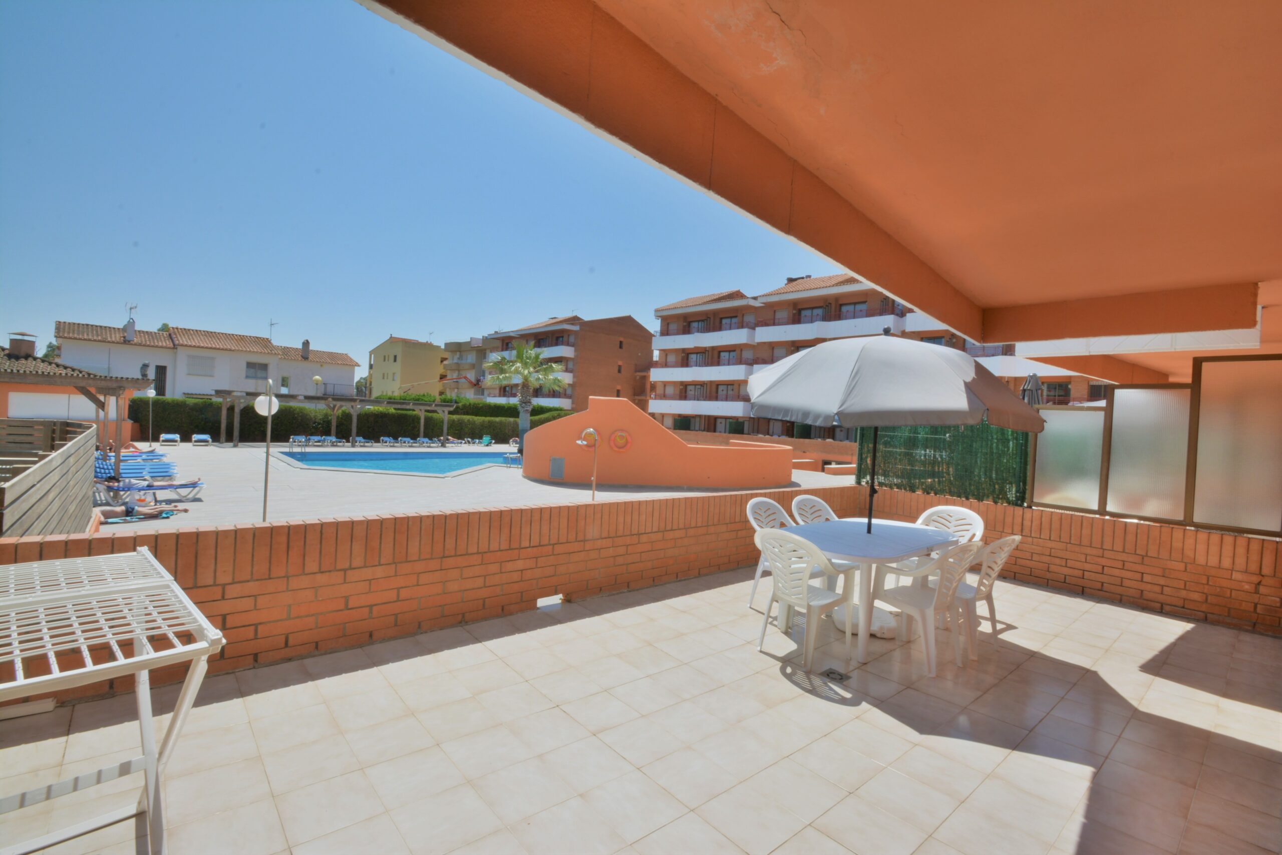 - Gran terraza amueblada y con sombrilla con vistas a la piscina.